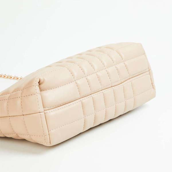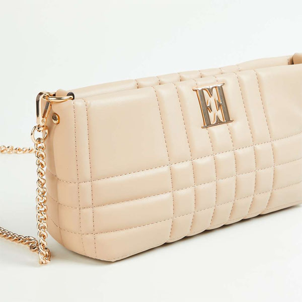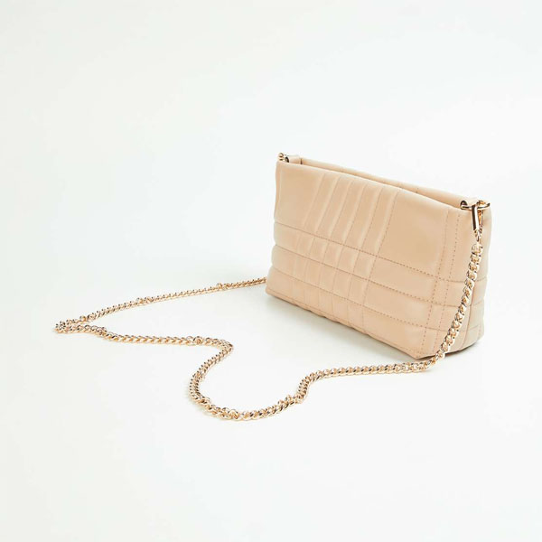 Amp up your fashion quotient in this bag that features spacious pockets, a quilted design, a detachable sling chain, and an embellished detail.