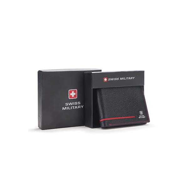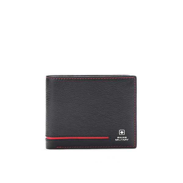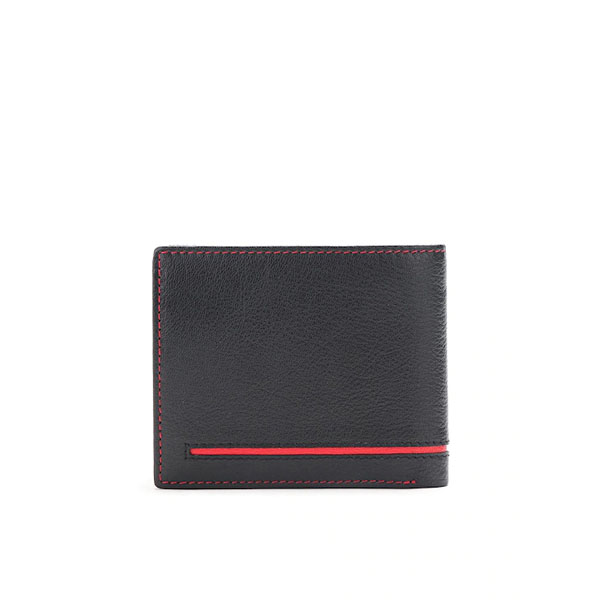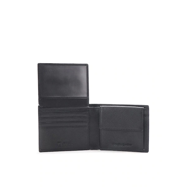 Black solid two fold wallet, 2 main compartments, has a non detachable flap 5 card holders, 1 slip pocket, has a flap coin pocket Warranty: 6 months Warranty provided by brand owner/manufacturer