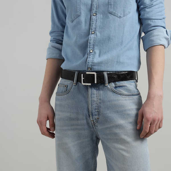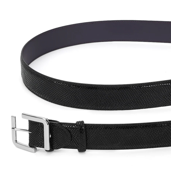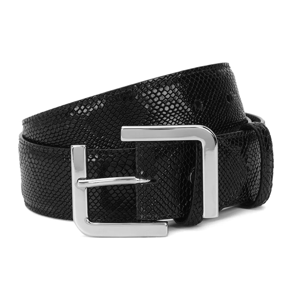 Add edge to your outfit with this sleek mock snake print belt. The silver buckle provides modern appeal, while the single loop design keeps it minimal. Features a curved tip for added sophistication and secure fastening. Pair with black leather shoes for a cohesive look.
